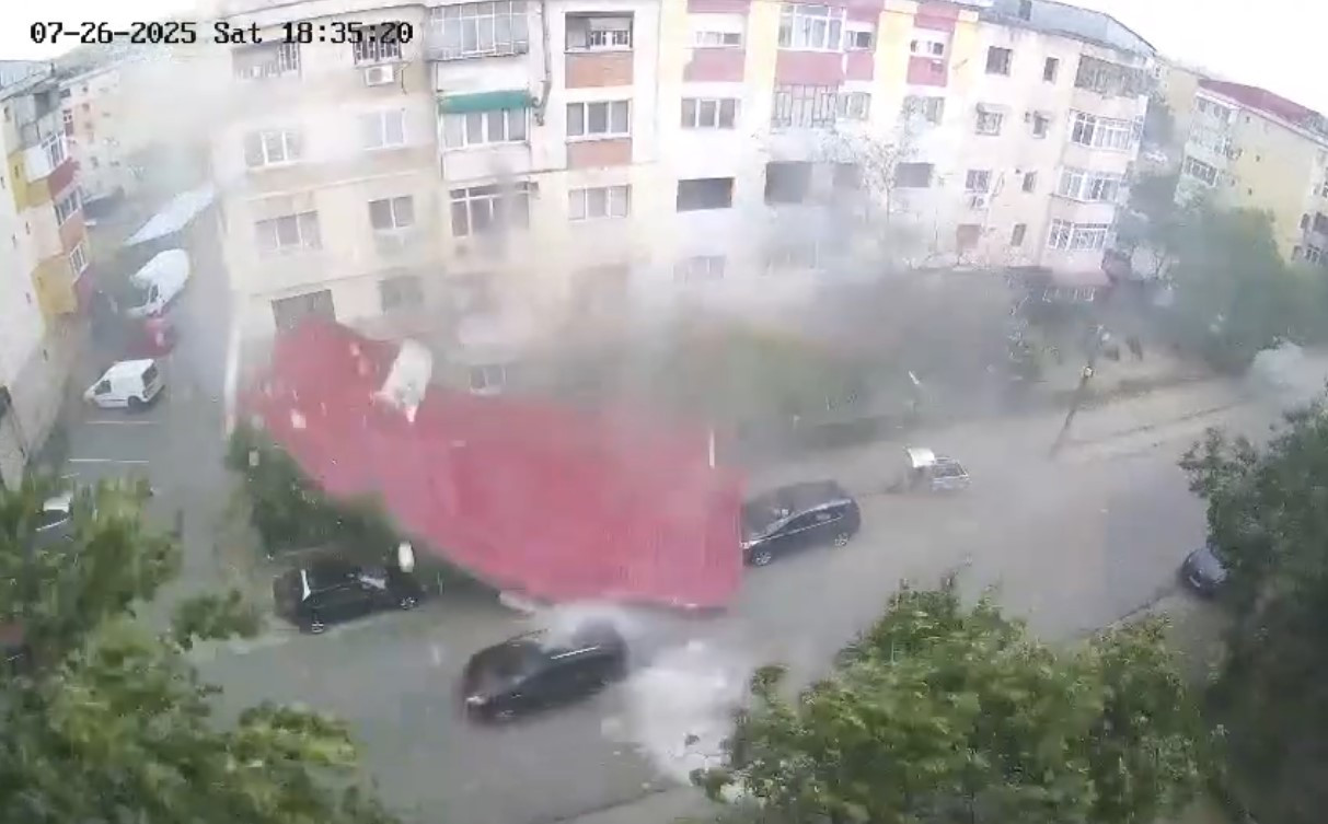 După o zi în care România a fiert la 43 de grade Celsius la umbră, în vestul ţării s-a dezlănţuit iadul. Furtunile şi vijeliile au făcut prăpăd. La Târgu Jiu, un copac a căzut chiar lângă masa lui Brâncuşi, un bărbat din judeţul Timiş a ajuns în spital, după ce un copac s-a prăbuşit peste el, un maratonist a fost ucis de un arbore în Suceava, iar în judeţul Sibiu, mai multe gospodării au fost inundate, după ce un râu a ieşit din matcă. La Calafat, camerele de supraveghere au surprins momentul în care acoperişul unui bloc este smuls de rafele şi se prăbuşeşte pe stradă.
